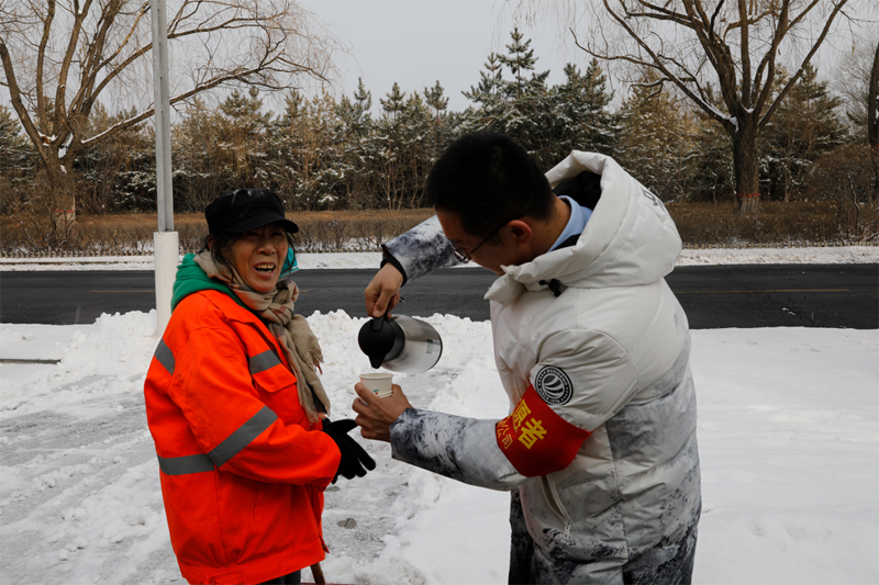 “叔叔阿姨,清理一天积雪辛苦了,先歇一歇,请您们喝杯奶茶。”